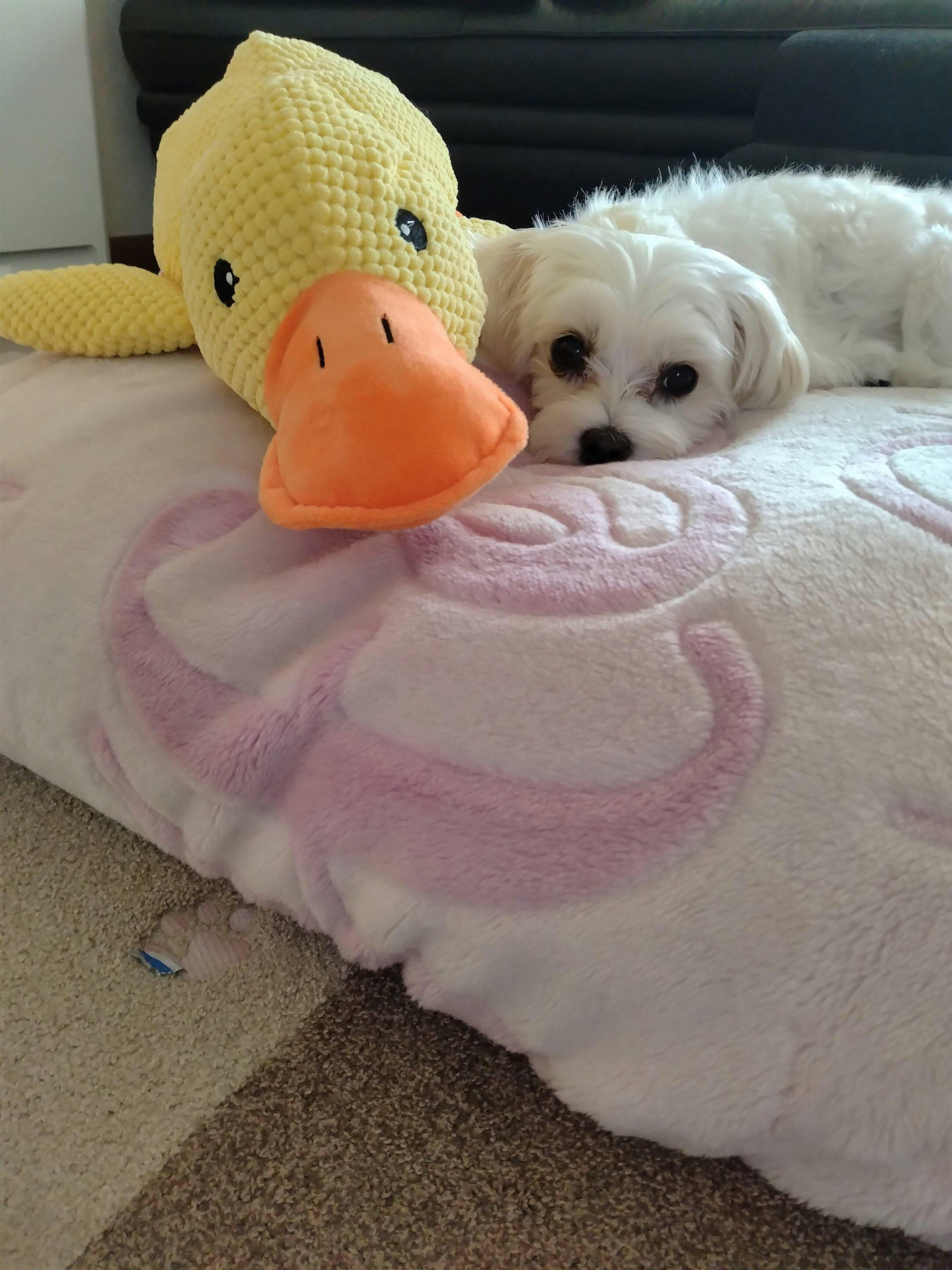 あらかじめアヒルをギューっと抱きしめたり遊んだりして、布地に飼い主さまのにおい移しておくとGood。留守番時の不安対策にも◎